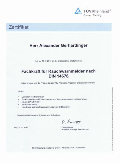 Als Handwerksmeister bin ich zusätlicher zertifizierte Fachkraft für Rauchmelder nach DIN 14676